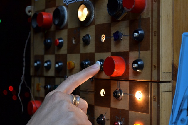 Random and fun interactive art piece in Szimpla Ruin Bar. This basic circuit board controls a crazy assortment of lights, bells, whistles and music.