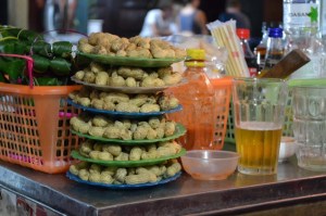 Never drink a bia hoi without a snack. Shrimp chips, peanuts, and pork in banana leaves seem to be the munchies of choice.