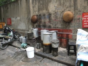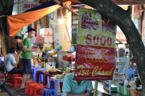 One of the things that we liked most about Hanoi is that it is easy to distinguish the tourist traps from the genuinely local places. We have learned that the backpacker trail through Vietnam is well defined, with Hanoi being a hub for nearly all tourists that visit the country; therefore, Western-oriented establishments are ubiquitous. Ones that consist of very small plastic stools and tables on the sidewalk are a good indication that you are in for the real deal. These types of restaurants are the definition of hole in the wall. Sometimes they have a small portable cooking station on site, other times your order is relayed via cell phone to a kitchen down the street, and 10 minutes later someone comes walking down the block with your meal in hand.