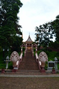 Following the palace we grabbed a quick bite to eat and headed back along the river to see where the city of Phnom Penh gets its name. The city existed for centuries before becoming the capital and the story goes that an old lady named Penh found four Buddha statues floating on a log during a massive flood. She had a temple built upon the tallest hill in the area to house the Buddhas. “Phnom” means hill in Khmer, and since the temple was constructed under the orders of Penh, the city became known as Phnom Penh, or Penh’s hill.