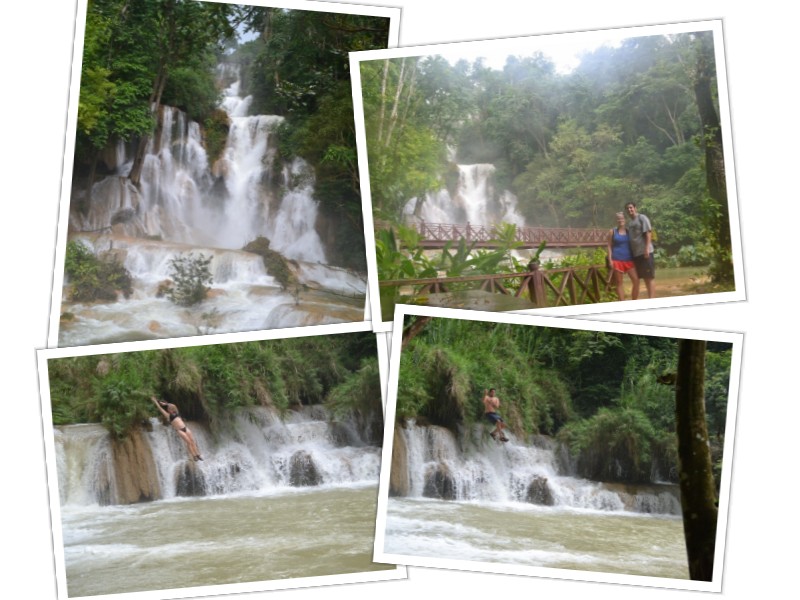 Another well-known attraction in the area is Kuang Si Falls. When it comes to waterfalls, Amy is hard to impress. The many falls of the Colombia River Gorge near her hometown of Portland, OR are tough to beat. This particular waterfall definitely met her expectations. At first, it seemed like nothing more than a fast flowing jungle river with some small drop offs, pools, and rope swings. As we made our way upstream, we stopped for some fun and took a few turns on the swing ourselves before running into one of the most spectacular waterfalls we have ever seen. This bad boy seemed to stretch on forever as it disappeared into the clouds escaping the reach of our camera lens.