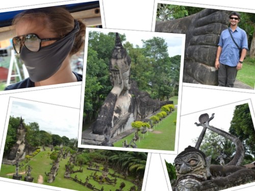Just 30 minutes outside of the city lays Xieng Khuan, known to many as the Buddha Park. It was a hellishly bumpy and dusty tuk-tuk ride to get there, but well worth the journey. The main attraction at this relatively small park is an enormous statue of Buddha lying on his side. When we say enormous, we mean it; the feet alone are about two meters tall! Although it may be a cop-out to say “pictures don’t do it justice,” we’re going to play that card anyway.